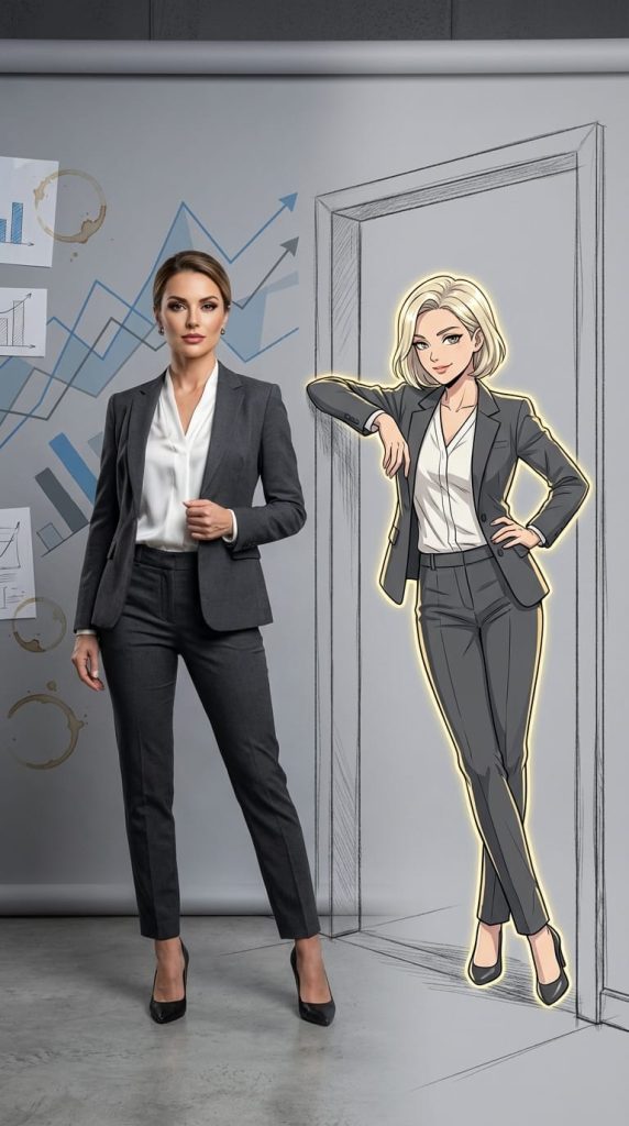 一幅独特的混合媒介肖像作品,画面由两部分组成:左侧是一位表情干练自信的真人女性办公室职员,身穿白色丝质衬衫与深灰色西装外套;右侧是她风格化的动漫倒影分身,以2D赛璐珞插画风格呈现,被置于一个铅笔勾勒的矩形门框中。