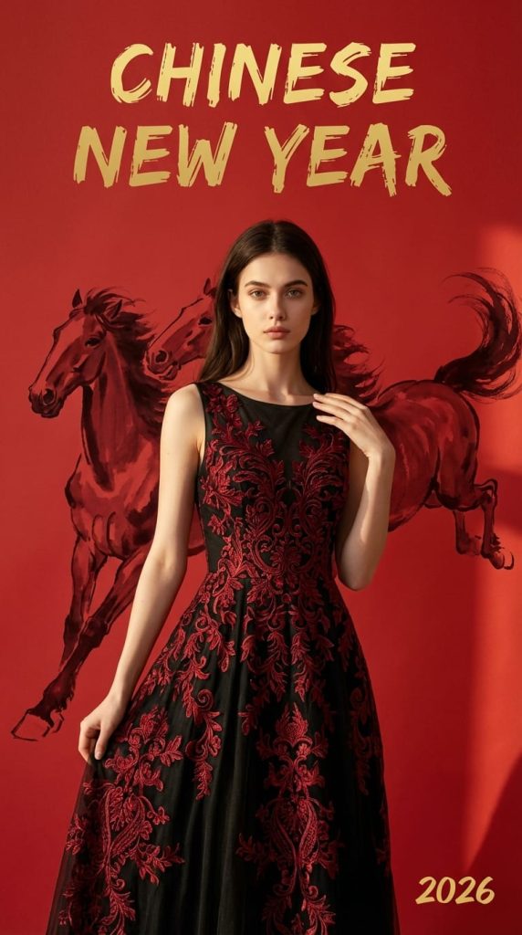 背景采用哑光 vibrant red 纸张质感。柔和自然的定向光源为人物与身后的水墨马匹投下细腻阴影,并在其轮廓上勾勒出温暖的柔光高光。画面顶部以醒目的字体排版呈现“CHINESE NEW YEAR”字样,右下角标注“2026”。