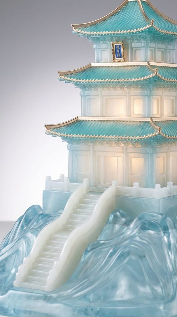The pavilion is made of semi-transparent, jade-like softly frosted glass in refined milky white and ice-blue tones. Translucent turquoise-blue glass roofs feature delicately tapered profiles, accented with finely detailed champagne-gold ornamental edges and intricate golden flying-eave details. A warm, subtle golden light glows gently from within through translucent windows. A small vertical blue-and-gold plaque is precisely embedded on the upper tier façade. It stands on a simplified, smooth sculptural base inspired by stylized mountains and calm water, carved from semi-transparent ice-blue crystal with elegant flowing contours. A clean white jade staircase rises diagonally and seamlessly from within the base toward the entrance.