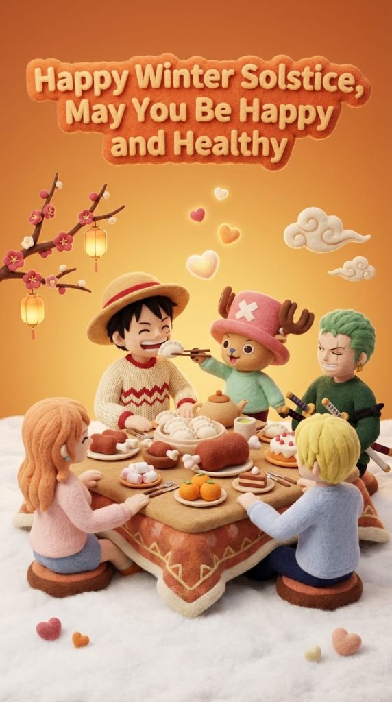 背景为温暖的橙黄色渐变,顶部悬浮着巨大、发光且具有毛绒质感的艺术字体“冬至快乐,幸福安康”。整体采用暖光摄影棚照明,垂直2:3比例,8K高分辨率渲染,细节丰富,营造出冬至伙伴团聚的节日氛围。