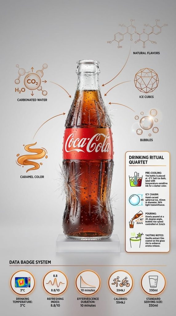 核心构图:极简主义商业信息图,中央矗立一瓶冰镇可口可乐。瓶身表面覆盖动态冷凝层,霜花呈放射状结晶。标志性红色标签经UV激凸工艺处理,琥珀焦糖渐变色调贯穿画面。