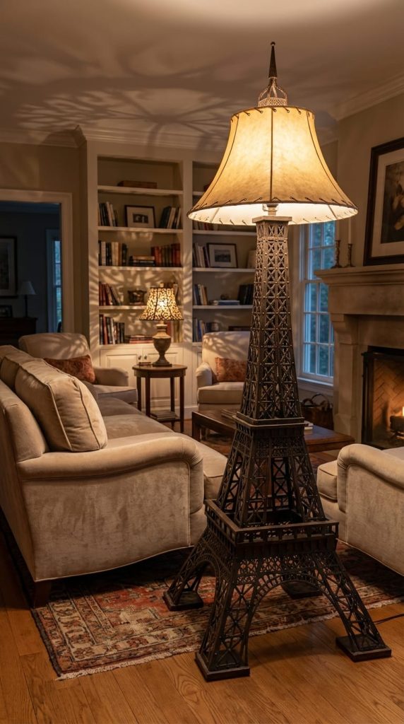The living room environment is authentic and lived-in, bathed in soft ambient light. The detailing on the Eiffel Tower lamp is astonishingly precise; its metallic structure, rivets, and latticework are meticulously reproduced, as if a miniature landmark were placed indoors. The lampshade is ingeniously integrated into the spire or body of the tower. When illuminated, light casts unique patterns through the latticework. As a normal-scale furniture piece, its height is in harmonious proportion with other items like sofas and rugs in the room.