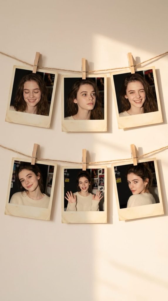 每张宝丽来相纸都依据参考图的视觉风格进行创作,呈现统一的怀旧质感,边缘轻微卷曲,色彩带有时光沉淀的哑光色调。照片捕捉了六个自然瞬间:闭眼浅笑、仰望遐思、俏皮眨眼、侧首莞尔、活力挥手以及浪漫回眸。柔和的漫射光线从侧面而来,在墙面投下淡淡阴影,模拟午后阳光。背景墙的柔和色调与宝丽来相纸的暖白色形成和谐对比。