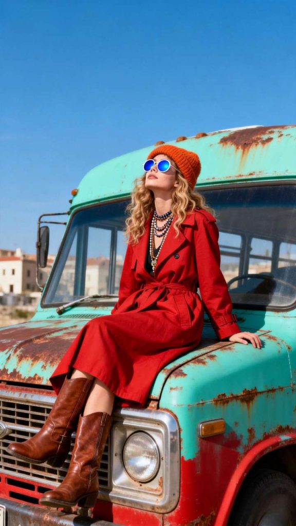 她身着鲜明的红色长款风衣,头戴暖色羊毛便帽,佩戴圆形蓝色墨镜与叠层项链,脚穿粗犷的棕色皮靴。