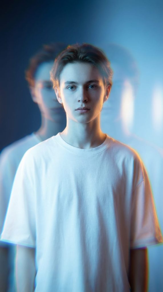 The image blends minimalism with light play to achieve a surreal, digital-youth mood, creating a visually experimental and clean yet dynamic aesthetic.