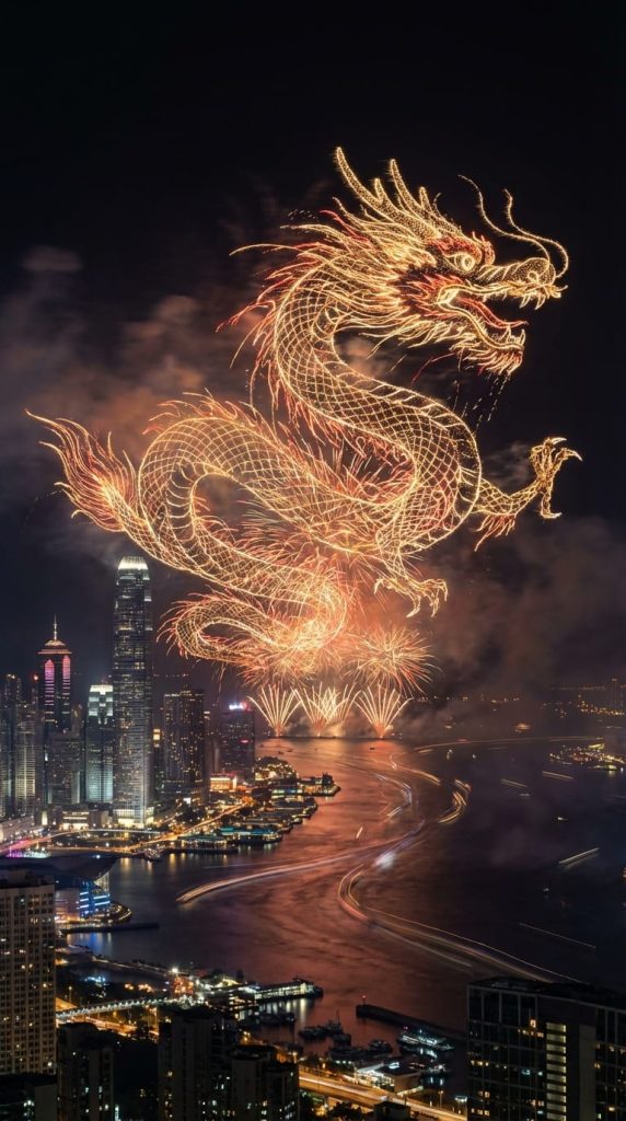 A hyper-realistic 4K long-exposure photograph with a cinematic composition. It captures a grand, spectacular fireworks display erupting over the [city skyline or famous landmark] against a deep black night sky, which provides maximum contrast.
