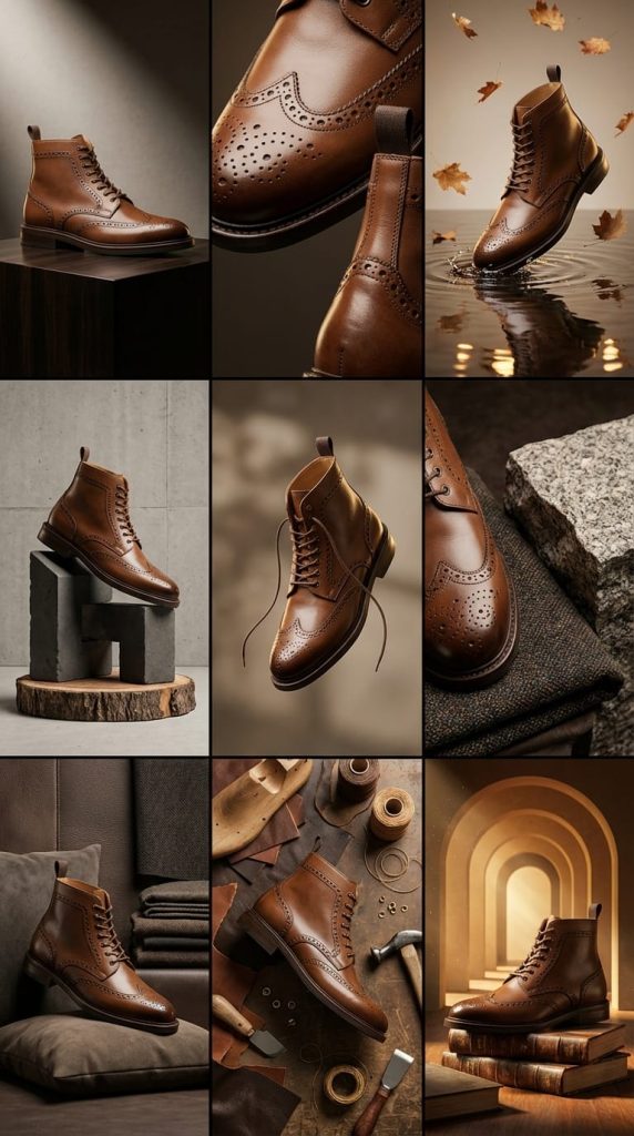 - Monochrome Luxury: A color-blocked scene where the background harmonizes with the shoe’s warm brown or deep coffee hue.