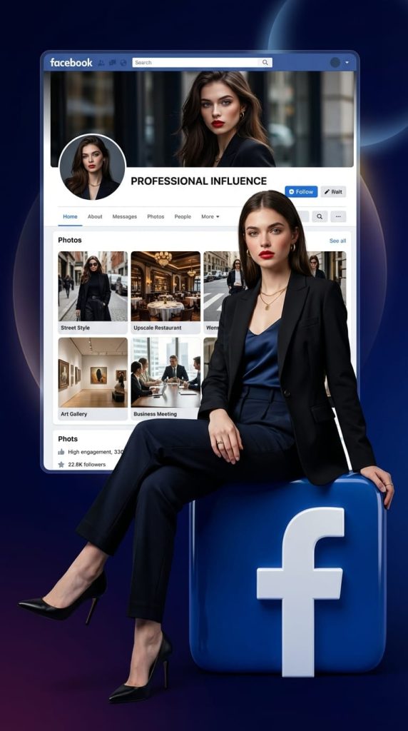 一幅依据提供的人物参考图进行设计的超写实竖版肖像作品。人物以自信且富有气场的御姐姿态,坐在一个巨大的、光泽深邃的3D Facebook “f” 标志上。其身后悬浮着一个高度写实的Facebook个人资料界面。