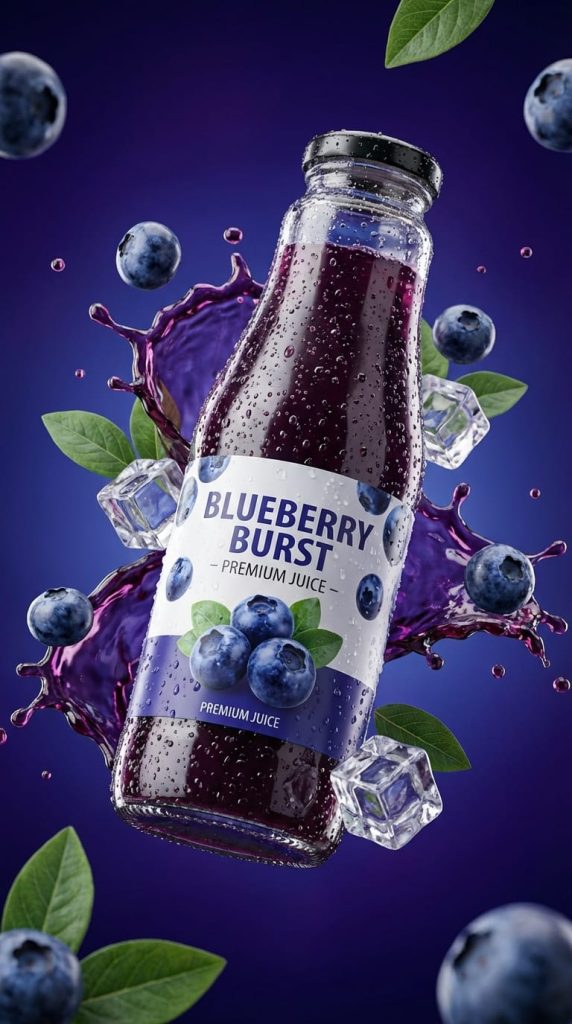 The blueberry juice bottle is slightly tilted and positioned at the visual center of the frame. Each condensation droplet on the bottle meticulously reflects ambient light, appearing crystal clear. Splashing droplets of deep violet juice, whole blueberries, clear ice cubes, and floating tiny blueberry stems and leaves are sharply defined, captured along their motion trajectories with extreme detail. The background is a rich gradient of deep blue and violet, perfectly complementing the juice‘s profound hue. Cinematic studio-style lighting creates bright highlights and crisp shadows on the bottle. The label is clearly legible, with subtle reflections beneath it, contributing to a profound sense of three-dimensionality and realism.
