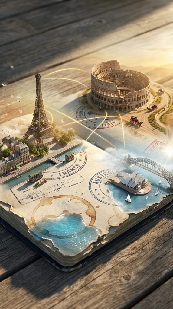 • Landmarks & Landscape: The Eiffel TowerRoman Colosseum, and Sydney Opera House stand at various scales upon the pages. Golden glowing flight routes weave through the air, connecting all the miniature worlds in a circuit.
