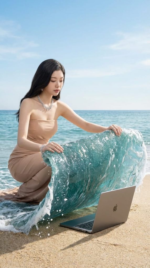 整体画面光线明亮、自然,风格偏向概念摄影与数字艺术。渲染需达到超写实品质,以确保海浪的质感、海水的通透感以及沙砾的细节都极为逼真,从而让这个巧妙的幻觉既充满想象力,又具备视觉上的可信度。