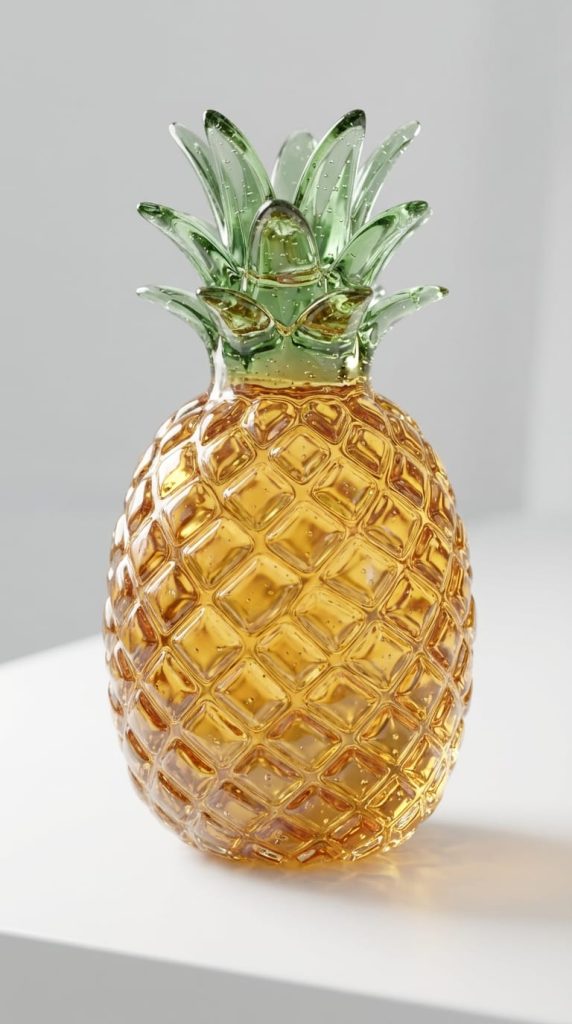 A hyper-realistic pineapple made of translucent glass. It faithfully replicates the pineapple’s iconic golden-yellow color, stout oval shape, distinctive diamond-patterned textured skin, and the green leafy crown on top. The surface is smooth and rounded, with fine air bubbles visible inside, giving it a crystal-like, translucent quality.