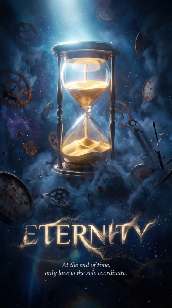A high-Kelvin color temperature scheme is employed, dominated by deep cosmic blues, dark purples, and the gold of the flowing hourglass sand. A cold light source shines from the top of the hourglass, casting sharp, long shadows on the floating clock fragments. Delicate volumetric fog permeates the scene, enhancing spatial depth. The title “Eternal” is rendered in kinetic typography: the letterforms are composed of flowing sand, visually “dissolving” and “flowing” from top to bottom, with parts of the strokes crumbling into drifting stardust at their ends. The typography appears as if coalesced from the ambient light and sand, fully integrated into the environment. A short, emotionally resonant tagline beneath the title reads: “At the end of time, only love is the true coordinate.” The entire image simulates cinematic lens qualities with soft bloom, subtle lens flare, and fine film grain.