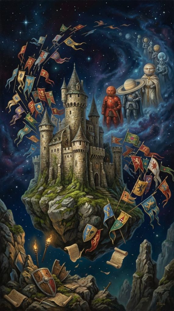Countless medieval knightly pennants, each bearing different family coats of arms, flutter out from the castle’s towers and windows as if enchanted, dancing weightlessly around the structure. In the distance, planets of the solar system (like Mars, Saturn, Jupiter) are personified as noble knights or lords who have come to pay a visit or await an audience, lining up in an orderly, quiet queue. The rock’s surface is scattered with ancient shields, extinguished torches, and scrolls, enhancing the medieval legendary atmosphere alongside the castle’s ancient walls.