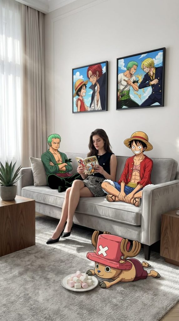一幅高保真广角室内摄影,捕捉一个现代客厅中超现实的混合媒介场景。一位面容、发型与服饰与参考照片完全一致的人物,坐在中央的浅灰色绒面沙发上。整个空间无缝融合了照片级真实的3D环境与赛璐珞风格的2D《海贼王》角色,角色们与物理空间直接互动。