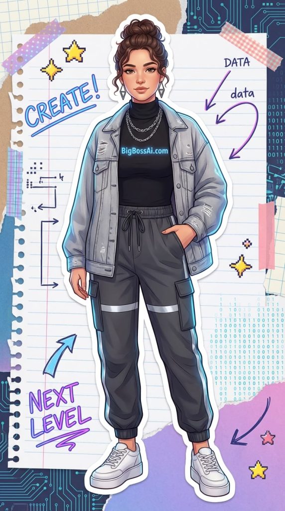 她将参考图像中的面部,与一个全新的、充满现代科技感的全身造型相结合。她梳着略带凌乱的发髻,额前垂下几缕柔软的卷发。上身内穿一件黑色高领修身长袖衫,胸前带有简洁的发光“BigBossAi”字样图案;外搭一件** oversized 的浅灰色牛仔夹克,布料呈现细微的做旧纹理。下身穿着深灰色机能风束脚运动裤,侧边有反光条细节,脚踩一双白色厚底运动鞋。配饰包括一条银色多层链式项链和几何形金属耳环**。姿态放松而自信,一手随意插在裤袋中。