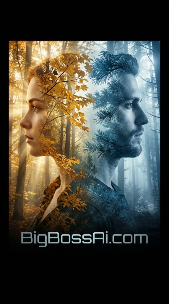 The woman‘s side glows with warm golden autumn hues, while the man’s side is illuminated by cool, serene blue tones. Soft rays of sunlight filter through the trees, adding depth, contrast, and emotional atmosphere. The lighting transitions smoothly against a clean black backdrop.