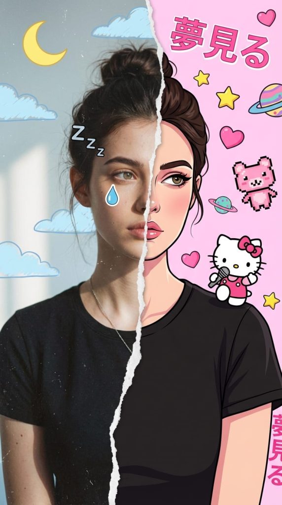 右侧为卡通风格:背景转变为明亮、饱和的浅粉色波普艺术风格。人物发型色调与左侧一致,但经过风格化处理,眼线夸张,表情更具戏剧性。此侧装饰着丰富的卡哇伊元素,例如手持话筒的Hello Kitty、像素风粉色吉祥物、黄色星星、粉色爱心、彩色星球以及粗体的粉色日文字符。
