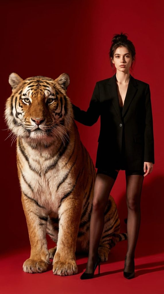 一张极具电影感的正面肖像照片。一位自信时尚的女性与一头巨大的老虎并肩正对镜头站立。女性身着利落的西装外套、黑丝与高跟鞋,神态从容。她将一只手自然地放在身旁老虎的躯干上,清晰地表明这头猛兽是她训练有素、忠诚的守护伙伴。