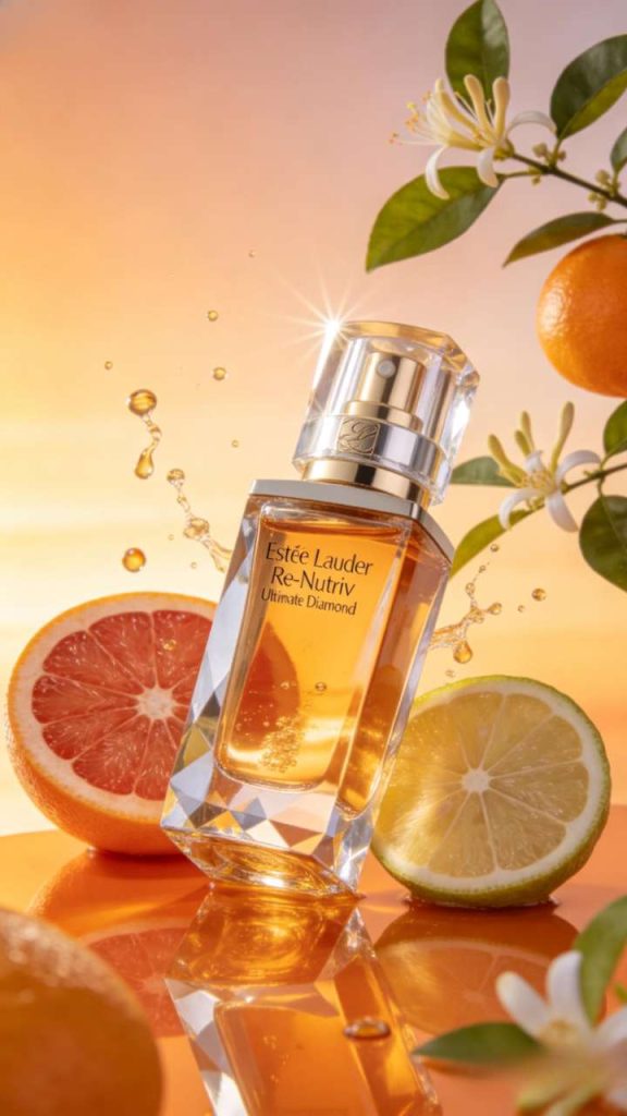 The bottle is engraved with the “Estée Lauder Re-Nutriv Ultimate Diamond” insignia. It is artistically framed by citrus fruits symbolizing vitality: blood oranges, sliced emperor mandarins, and bergamot. Platinum-gold serum droplets are captured mid-splash around the vessel, accompanied by delicate citrus leaves and honeysuckle sprigs evoking morning dew.