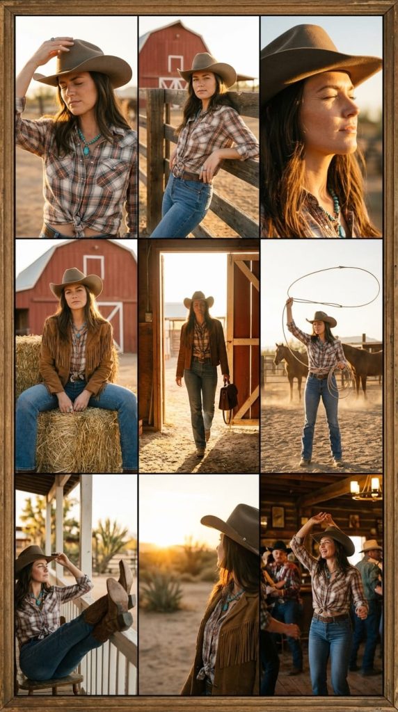 拼贴展现同一位自由奔放、拥有乡村野性之美的女性,在德克萨斯牧场环境中演绎九个连续瞬间:1. 轻触牛仔帽檐;2. 倚靠木质栅栏;3. 在阳光下眯眼的特写;4. 坐在干草捆上;5. 走过谷仓门;6. 在头顶旋转套索;7. 将靴子架在门廊栏杆上;8. 凝视日落天际线;9. 在乡村酒吧跳舞。她身着牛仔衬衫系于腰间、流苏麂皮夹克、牛仔靴、宽檐帽,佩戴绿松石首饰。