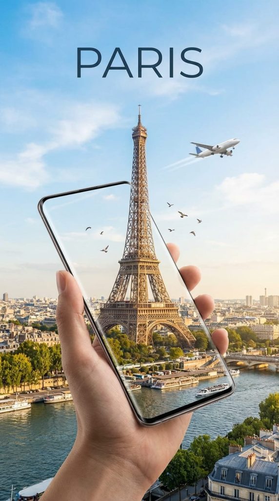 手机屏幕上显示着法国巴黎埃菲尔铁塔的高清图像。这座地标并未被禁锢在屏幕内——它的塔身从屏幕中自然“生长”出来,与广告中的真实背景天衣无缝地融为一体。背景是巴黎典型的城市天际线与塞纳河岸风光。