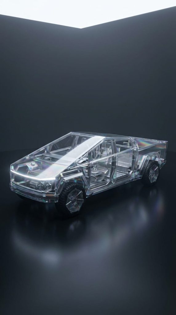 The vehicle‘s iconic angular glass panels possess a high-gloss finish, refracting a cool and subtle spectrum of rainbow colors under powerful studio lighting at approximately 7000K. Beneath the ultra-transparent shell, the hardcore internal world is clearly exposed: the monolithic stainless-steel exoskeleton frame, the large skateboard-style battery module, independent suspension system, steer-by-wire mechanism, and the minimalist sci-fi-inspired cockpit (with yoke steering and central touchscreen). The truck’s unique proportions, the contrast between steel and glass materials, and the texture of the tires are all rendered authentically. Tesla‘s branding remains discernible even in this transparent form.