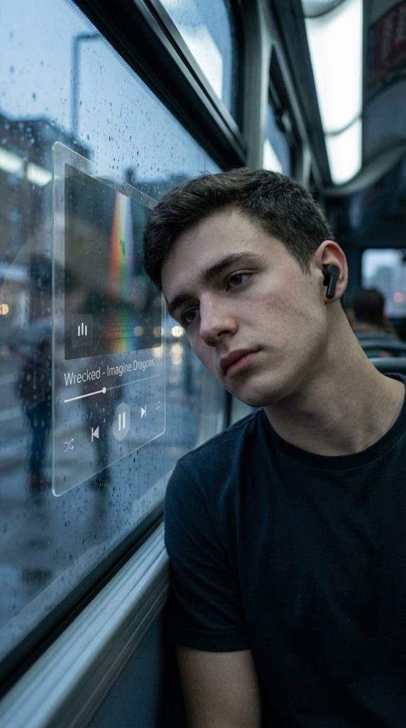 一个采用玻璃态设计风格的音乐播放器UI,被完美平整地物理附着在公交车窗玻璃的同一平面上(而非悬浮)。UI与车窗表面保持完全一致的旋转角度与透视,并带有极轻微的玻璃反光和折射效果,仿佛是车窗的一部分。UI上显示歌曲信息:“Wrecked – Imagine Dragons”。他的双耳佩戴着哑光黑色无线入耳式耳机,自然地贴合耳道。