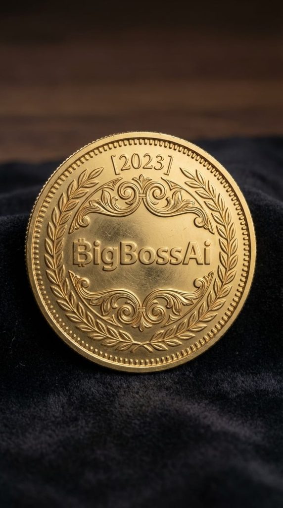 一幅高分辨率的摄影作品,主体为一枚以[BigBossAi]标志为中心的金色纪念币。