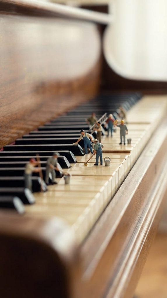 由于移轴镜头的效果,景深极浅,画面呈现出如微缩模型般的观感。琴键上,微小的人物形象正在使用刷子、布料和水桶等工具仔细地清洁每一个琴键。这些人物的动作生动,构成了一个充满奇趣与超现实感的场景。