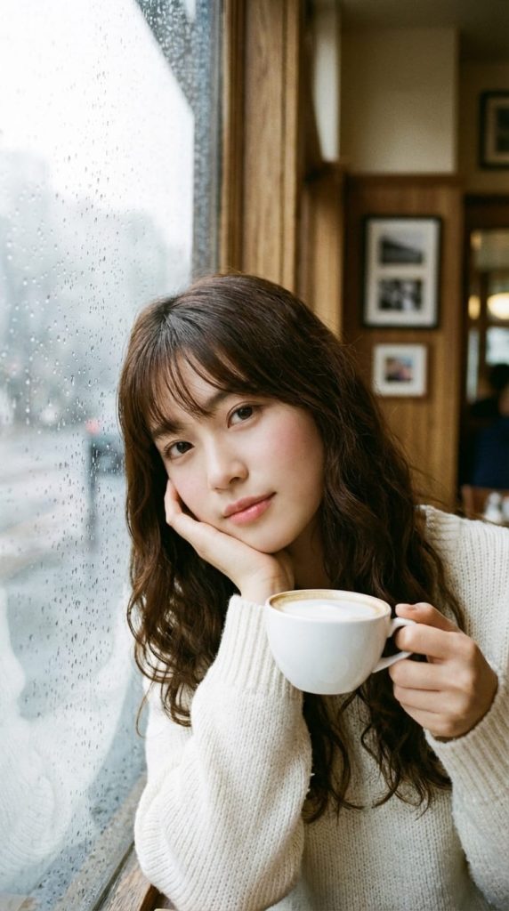 The overall tone is warm, nostalgic, with an analog film photography feel and slight grain. Despite the cool, rainy exterior, the interior scene radiates a cozy, serene, and contemplative “hygge” atmosphere. A shallow depth of field is employed, with sharp focus on the subject‘s eyes and expression, while both the background interior and the rainy street outside are softly blurred, enhancing a cinematic, slice-of-life intimacy.