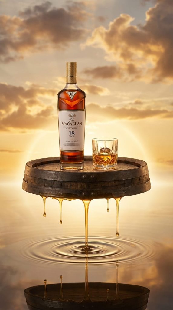 A highly detailed cinematic advertisement scene featuring The Macallan 18 Year Old Single Malt Scotch Whisky, standing on a surreal floating platform designed as a cross-section of an aged sherry oak cask, symbolizing its precious maturation.