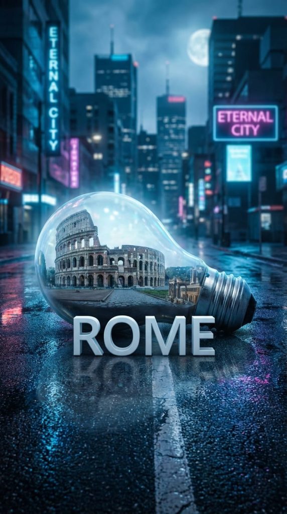 A hyper-realistic, stylish poster featuring a light bulb lying on wet urban asphalt after rain. Inside the bulb‘s glass chamber, a miniature version of [CITY] with its iconic cityscape is constructed.