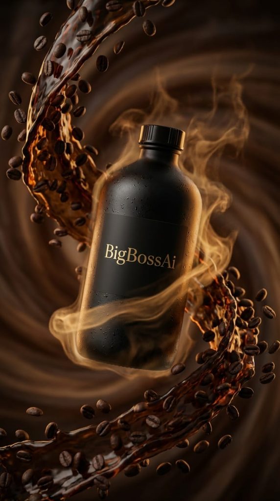 一款名为“BigBossAi”的奢华咖啡瓶,采用哑光黑色玻璃瓶身与金色字体标签,以直立姿态悬浮于动态场景的中心。其周围是深褐色浓缩咖啡液构成的汹涌涡流,其中翻滚着深色的烘焙咖啡豆。