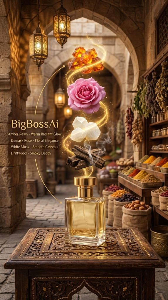 场景中央前景,一张雕刻繁复、镶嵌金线的深色木桌上,放置着一个透明的矩形玻璃香水瓶,瓶盖为金色金属,瓶内盛有淡金色的香水液体。从瓶中向上延伸,构成一个垂直排列的悬浮原料堆栈,散发着旋转的金色光辉与闪烁的微粒。从上至下依次为:散发着温润内部光芒的琥珀树脂、完全盛开的粉色大马士革玫瑰、光滑的白色麝香晶体,以及升起袅袅细烟的深色沉木块。