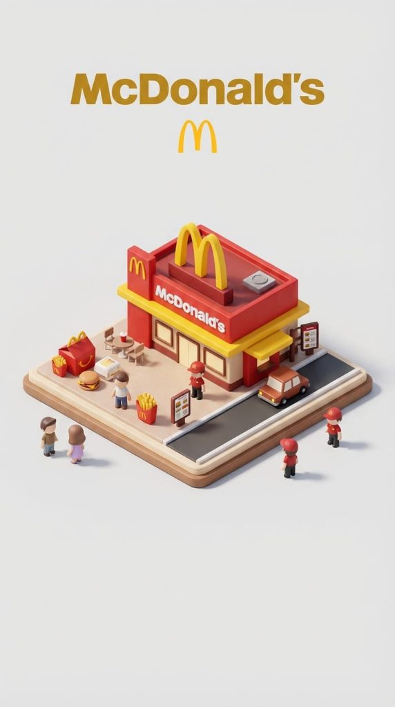 Use a clean solid [BACKGROUND COLOR] background. Display the word “McDonald‘s” in large bold text at the top-center, with the classic golden arches logo placed below. All text color automatically contrasts with the background. The composition is a perfectly centered 1080×1080 square, achieving an ultra-clean, high-clarity diorama aesthetic.