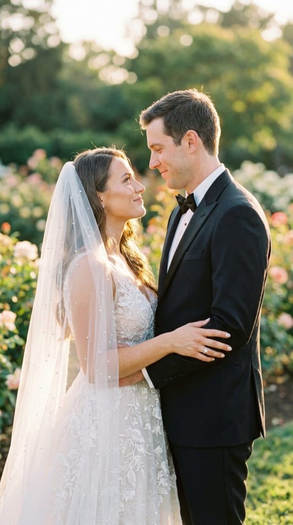 新娘身着高级手工蕾丝婚纱,刺绣精美,流动的头纱在逆光下透亮,佩戴精致的珍珠饰品,妆容自然,皮肤散发光泽。新郎穿着剪裁合体的黑色燕尾服,配以缎面翻领、白衬衫与奢华领结。两人姿态自然而富有格调——目光温柔交汇,带着浪漫的浅笑,双手优雅轻触。背景是虚化的花园,点缀着玫瑰花丛与绿植,呈现出温暖的色调。