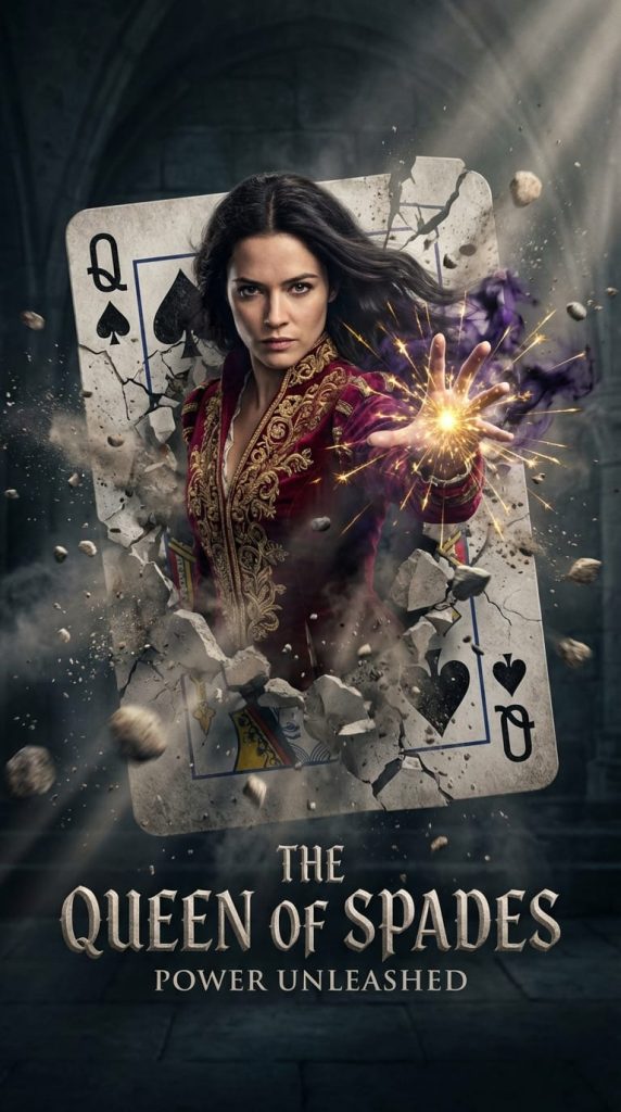 A hyper-realistic cinematic movie poster portraying a powerful female sorcerer. Her facial structure and likeness are identical to the reference photo. She is captured in the dynamic act of erupting through the center of a violently shattered Queen of Spades playing card. The card explodes outward as if made of stone, with fragments, dust, and debris frozen in a dramatic mid-air suspension.